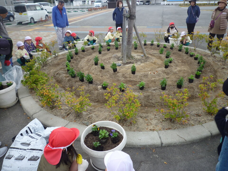 11月18日(火)、第2回中っ子はぐくみ事業「公民館でわくわくしよう!」での取り組みで、「博愛の里こども園の年長(満5歳)児」のかわいい子どもたちと中川副公民館の「たけの子くらぶ」のボランティアの皆さんとの【公民館プランター花植え】をテーマにした交流会を開催しました。