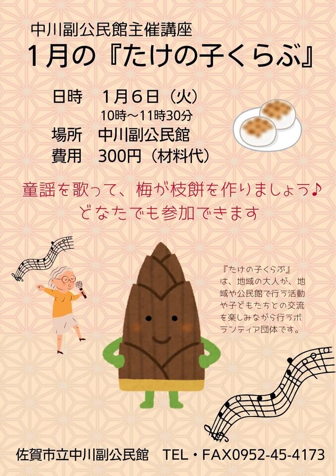 1月の中川副公民館主催講座『たけの子クラブ』の活動は、「梅が枝餅」作りと「童謡」を歌おう!です。毎月、たけの子くらぶの皆さんで、こども園の園児との交流のほか、「やってみたいこと」の計画を立てて楽しく活動していますが、1月は、新年らしく餅(梅が枝餅)を作って食べ、季節にちなんだ童謡をみんなで歌うようにしています。