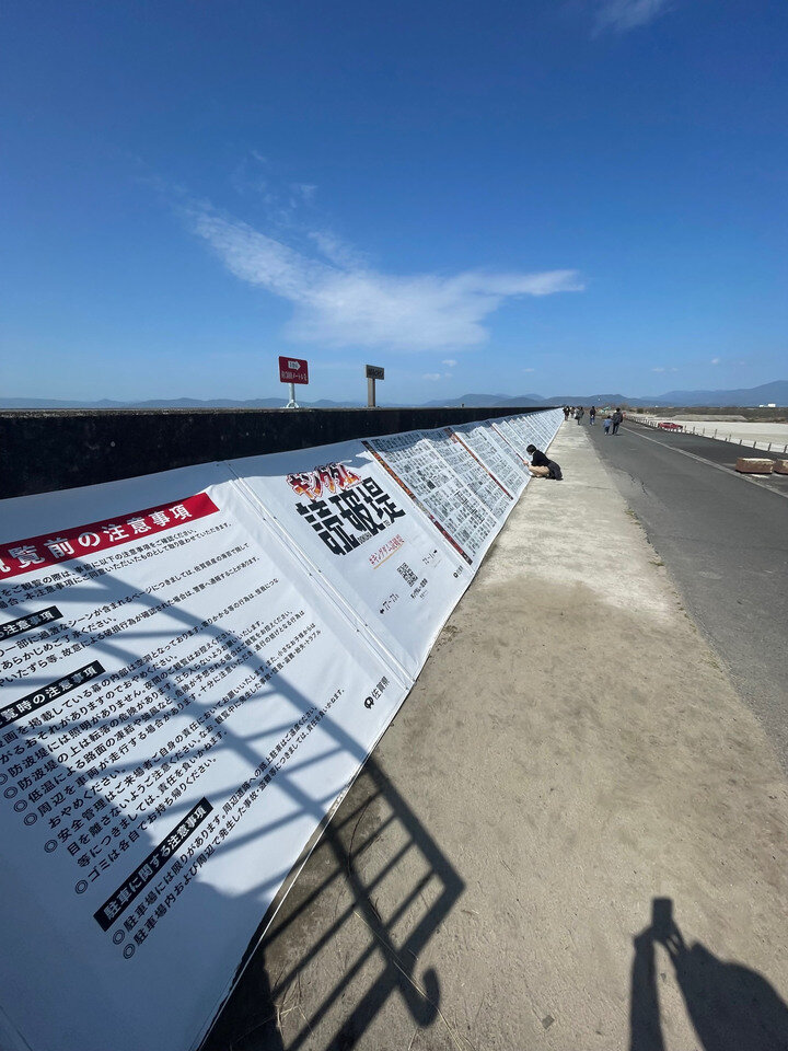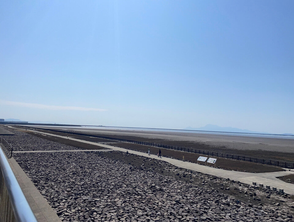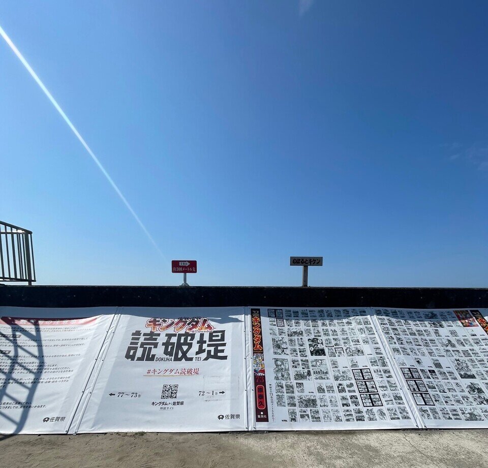 2026年9月30日まで延長された「キングダム×(駆ける)佐賀県」のプロジェクトとして、東与賀町の干潟よか公園の防波堤に300メートルに渡って「キングダム読破堤」が設置されています。「キングダム」のコミックの1巻から77巻までの全ページが防波堤に沿って無料公開されており、春の暖かな気候もあって、休日には多くの人が訪れて、熱心に見入っていました。久しぶりに干潟よか公園を訪れましたが、堤防から望む広大な干潟や遠方に見える雲仙の様子をのんびりと眺め、ゆったりと過ごすことができた一時でした。