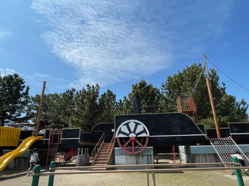 そして、たびたび「つながる佐賀市(中川副)」でも登場する「凌風丸」ですが、干潟よか公園に、幕末の佐賀藩が作った日本初の蒸気船「凌風丸」を模した大型の遊具が設置されています。この遊具は、以前は「三重津海軍所跡」にありましたが、世界文化遺産登録のために行われる国際機関による現地調査の前に、2014年に現在の場所へ移設されたものです。ほぼ実物大の大きさとなっており、遊具に登れば、当時の佐賀藩の先進性を感じることができます。みなさんも、干潟よか公園に行かれた際は、「凌風丸」の大きさを感じてください。