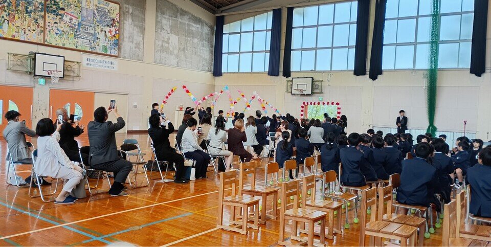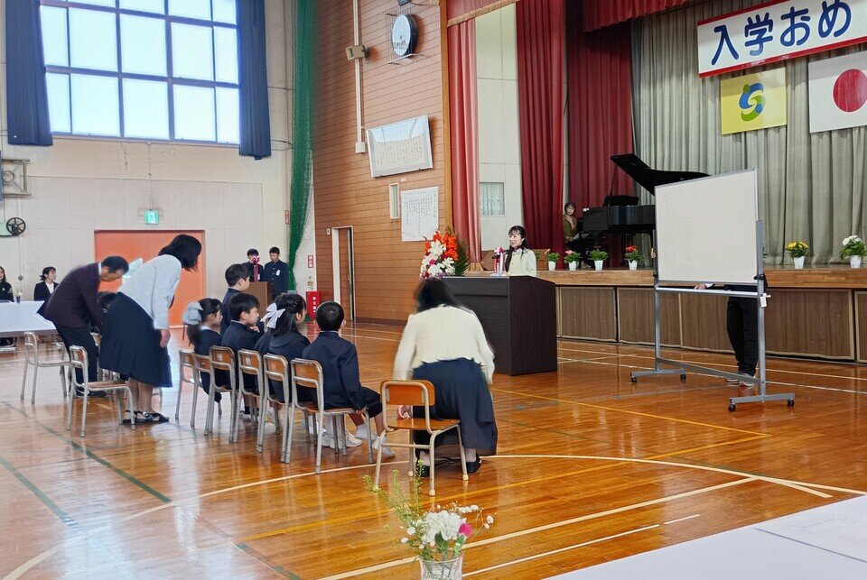 式は、上級生が作る「花のアーチ」に迎えられて始まりました。国歌斉唱、教科書授与、そして中武校長先生による「ウサギと亀」の寓話を用いた式辞。新一年生たちは、その一言一言を一生懸命に聞き取ろうと、真っ直ぐな瞳を正面に向けていました。交通安全ランドセルカバーなどの贈呈や在校生の歓迎を受け、式は温かな拍手に包まれました。