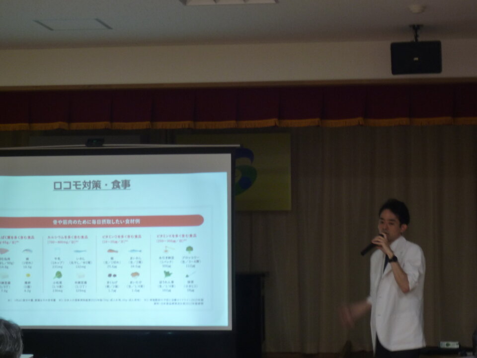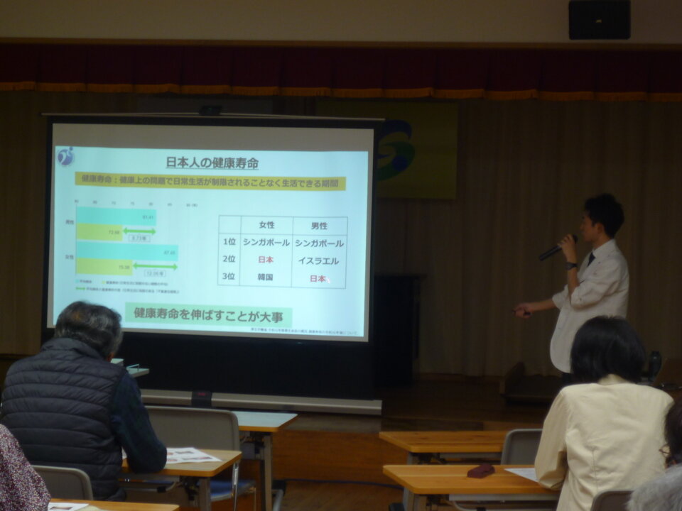 要支援の主な原因の第1位は「関節疾患」、第2位は「高齢による衰弱」、第3位は「骨折・転倒」となっているそうです。生活習慣(運動・食生活・社会参加)の改善が健康につながると熱心に耳をかたむけ、メモをされていました。
