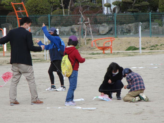 「凧揚げ」は、若楠公民館東にある「若楠広場」で行われました。子どもたちは空高く凧を揚げようと、広場で駆け回り何度もチャレンジしていました。スタッフの方は子どもたちを温かいまなざしで見守ったり、絡まった凧糸をほどいたりされていました。