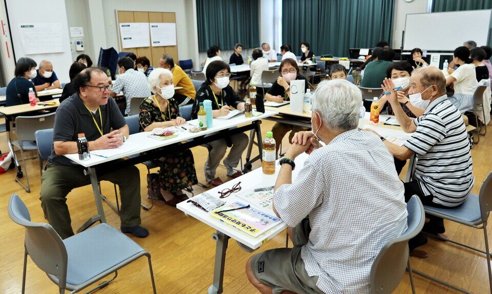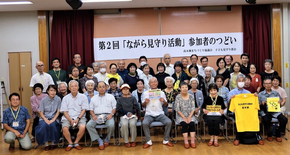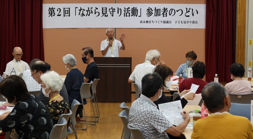 9月1日(日)、高木瀬公民館で開催された「第2回ながら見守り活動参加者の集い」の取材に行きました。この取り組みは、「高木瀬まちづくり協議会子ども部会」が主催して3年前に始められ、現在、247名の方が活動に登録されています。当日は、「ながら見守り活動」に登録されている約60名の方が参加され、6グループに分かれてお互いの「活動内容や活動状況」「良かったことや嬉しかったこと」「問題点」を出し合い、活発な意見交換が行われました。