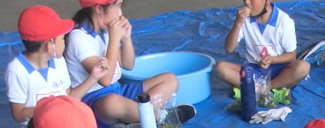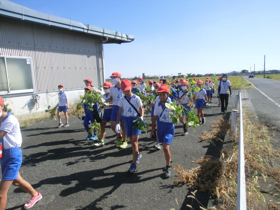 10月15日(金)秋晴れのもと、西川副小学校4年生47名が枝豆の収穫と試食を行いました。