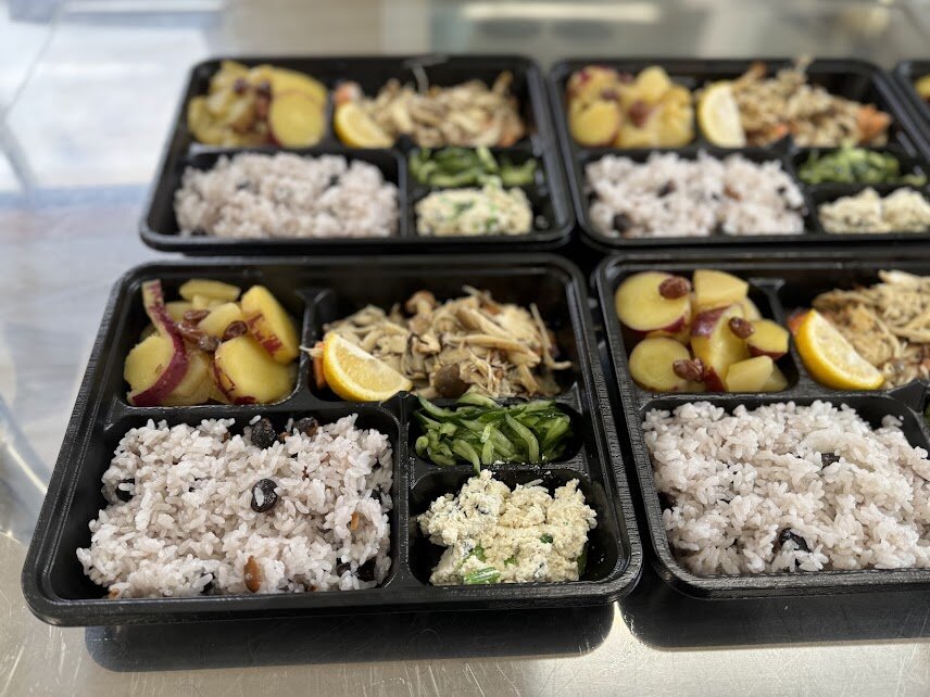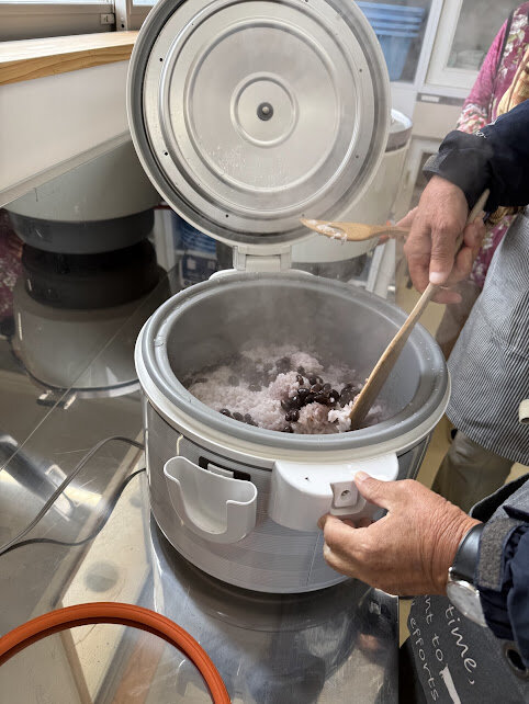 メニューは、『黒豆ご飯、鮭の塩麴焼き、海苔としらすの白和え、胡瓜の柚子胡椒漬け、さつま芋とリンゴの甘煮』です。