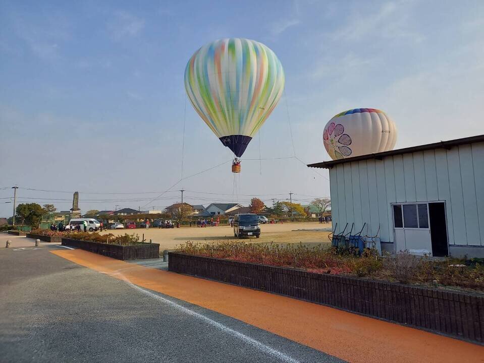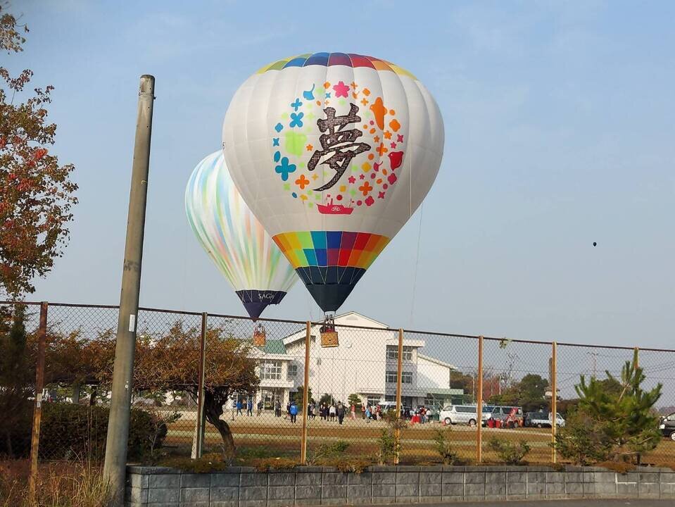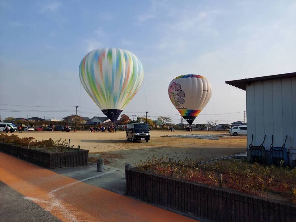 12月8日(月)西川副小学校の運動場でバルーン係留があり、子どもたちの歓声が運動場に響いていました。公民館からも大きなバルーンの姿を見ることができました。