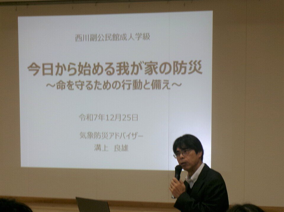 12月25日(木)の成人学級では、気象防災アドバイザーの溝上良雄さんを講師にお招きして、「今日から始める我が家の防災〜命を守るための行動と備え〜」をテーマに開催しました。