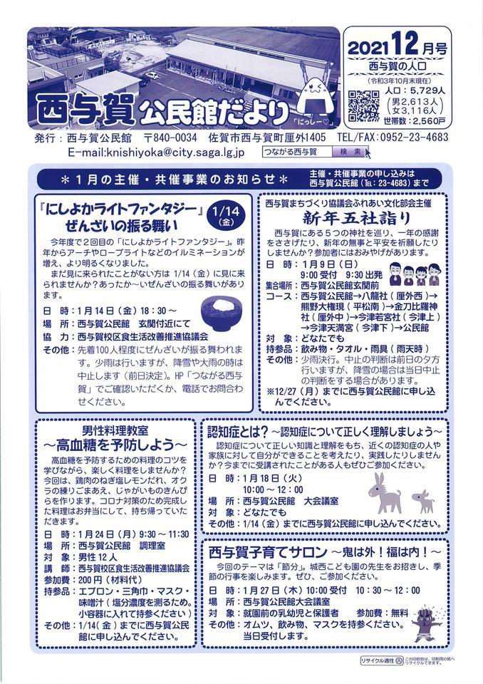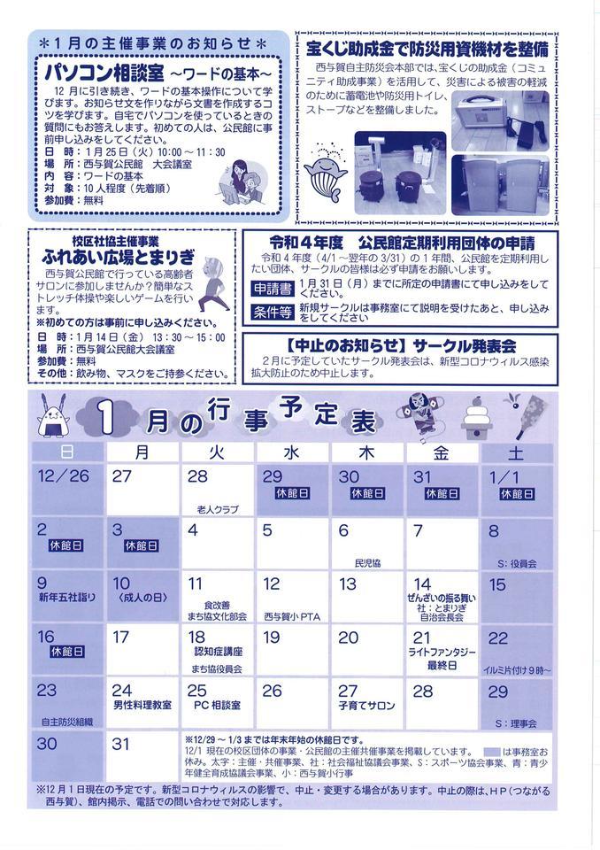 ★「にしよかライトファンタジー」ぜんざいの振る舞い★新年五社詣り★男性料理教室★認知症とは?★西与賀子育てサロン★パソコン相談室★宝くじ助成金で防災用資機材を整備★ふれあい広場とまりぎ★令和4年度 公民館定期利用団体の申請★【中止のお知らせ】サークル発表会★1月の行事予定