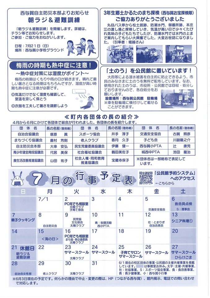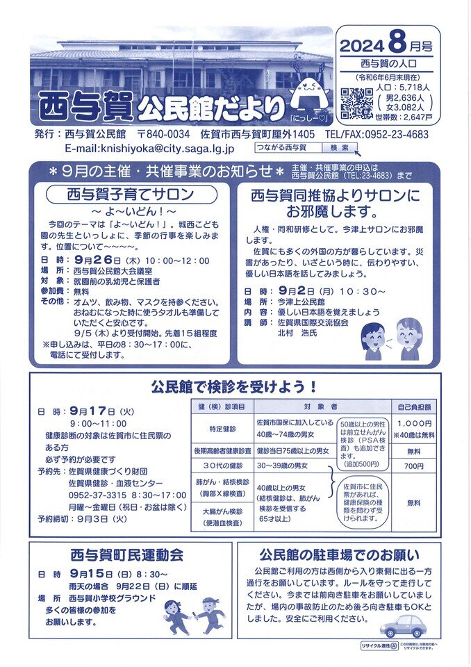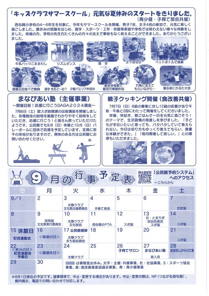 今月号の見どころ!!★西与賀子育てサロン★西与賀同推協よりお知らせ★公民館健診のお知らせ★西与賀町民運動会★公民館の駐車場での駐車に関してのお願いとお知らせ★キッズクラブサマースクール(ご報告)★まなびあい塾(ご報告)★親子クッキング(ご報告)★9月の行事予定