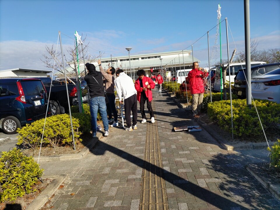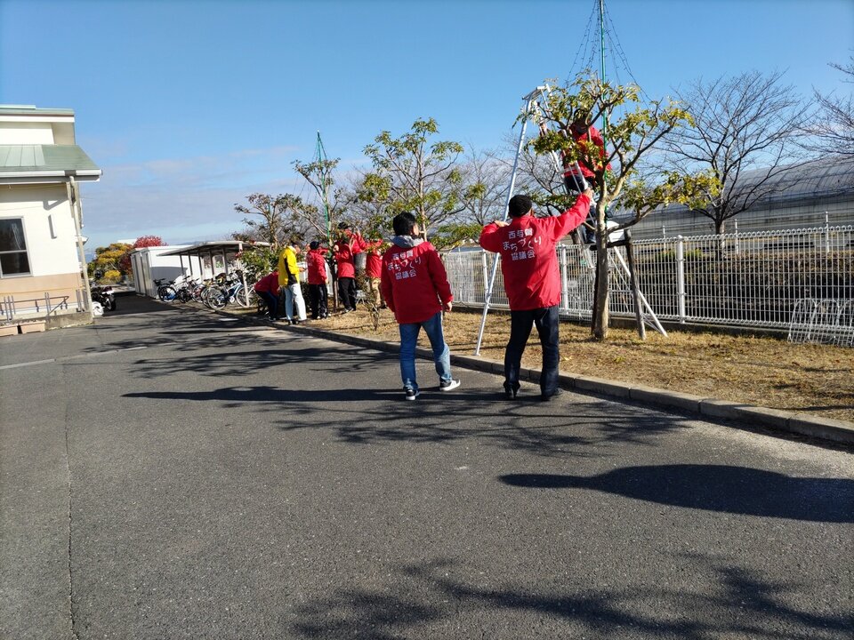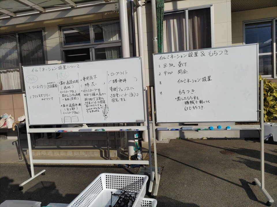 9時子育て部会長野中千恵美さんより挨拶がありイルミネーションの設置が始まりました。イルミネーションは公民館の駐車場を活用して西側、中央の並木の歩道、西側には10月25日に作成されたロープライトを塀を利用して飾り付けました。また、公民館の廊下にはクリスマスツリーも出来ました。