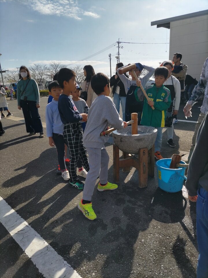 10時半ころにもち米が蒸し上がり、餅つきが始まりました。準備されたもち米は20Kgでした。蒸し上がったもち米は電動の餅つき機に入れ、つき上げられて石臼に移されました。子供たちの出番です。![]()