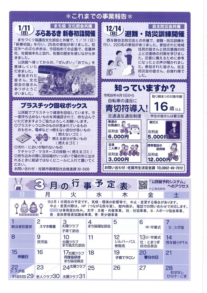 今月号の見どころ!!★西与賀子育てサロン★西与賀校区社会人権・同和教育推進協議会 人権研修★ワンコイン・シルバーパス券の販売★市税の納付は口座振替で★公民館でスマホ教室の開催予定★ぶらあるき新春初詣開催(ご報告)★避難・防災訓練開催(ご報告)★プラスチック回収ボックス★知っていますか?青切符導入!★3月の行事予定