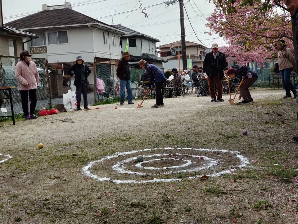 今年は子供の参加もあればということで、子どもを対象とした「紙飛行機大会」も起案しましたが残念ながら参加者0となり、、昨年と同じゲートボール大会(得点競争)を実施しました。