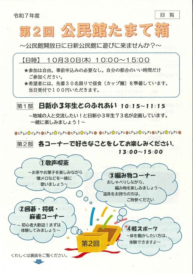 日新公民館では、第2回の「公民館たまて箱」を10月30日(木)に開催します。この日は、10時~15時まで公民館を開放しますので、自分の都合のいい時間にご来館ください。午前中は、日新小学校3年生とのふれあいを予定しています。小学生が地域の方との交流を楽しみに内容を企画してくれています。午後からは「歌声喫茶」「囲碁・将棋・麻雀」「編み物」などのコーナーで自由にお過ごしください。子どもたちと一緒に楽しいひとときを過ごしませんか?たくさんの方の参加をお待ちしております。