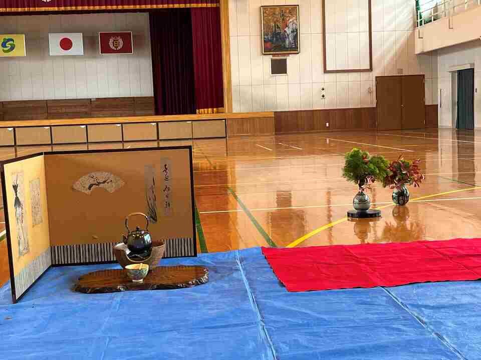 当日は雨天のため、例年実施している日新小学校の藤棚の下ではなく、体育館内での開催となりました。満開に近い藤の花のもとでの実施とはなりませんでしたが、会場には屏風を設え、花を生けるなどの工夫を凝らし、趣あるお茶の場を整えました。厳かな中にも和気あいあいとして雰囲気が広がり、これまでとまた違った趣のある茶会となりました。