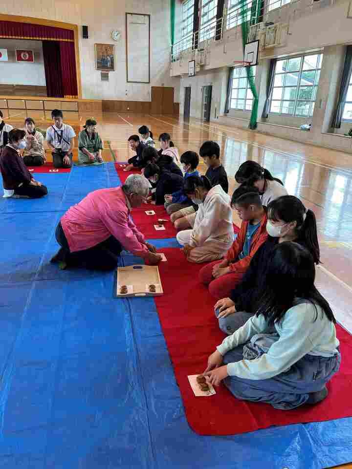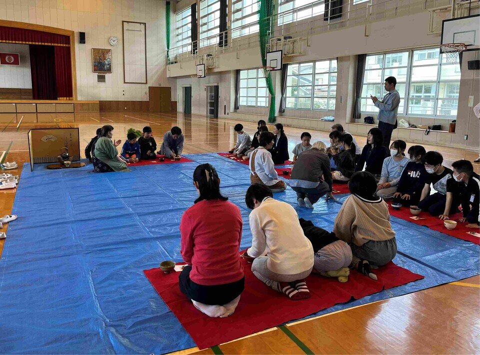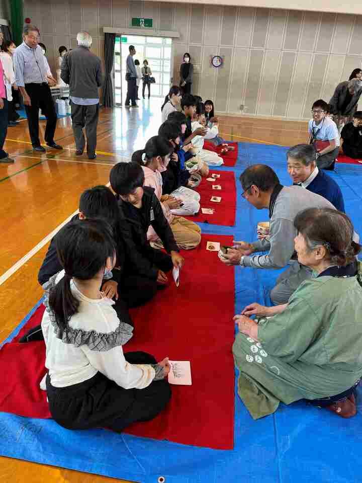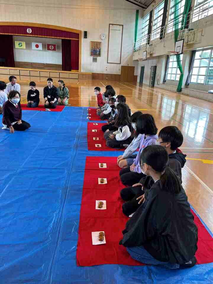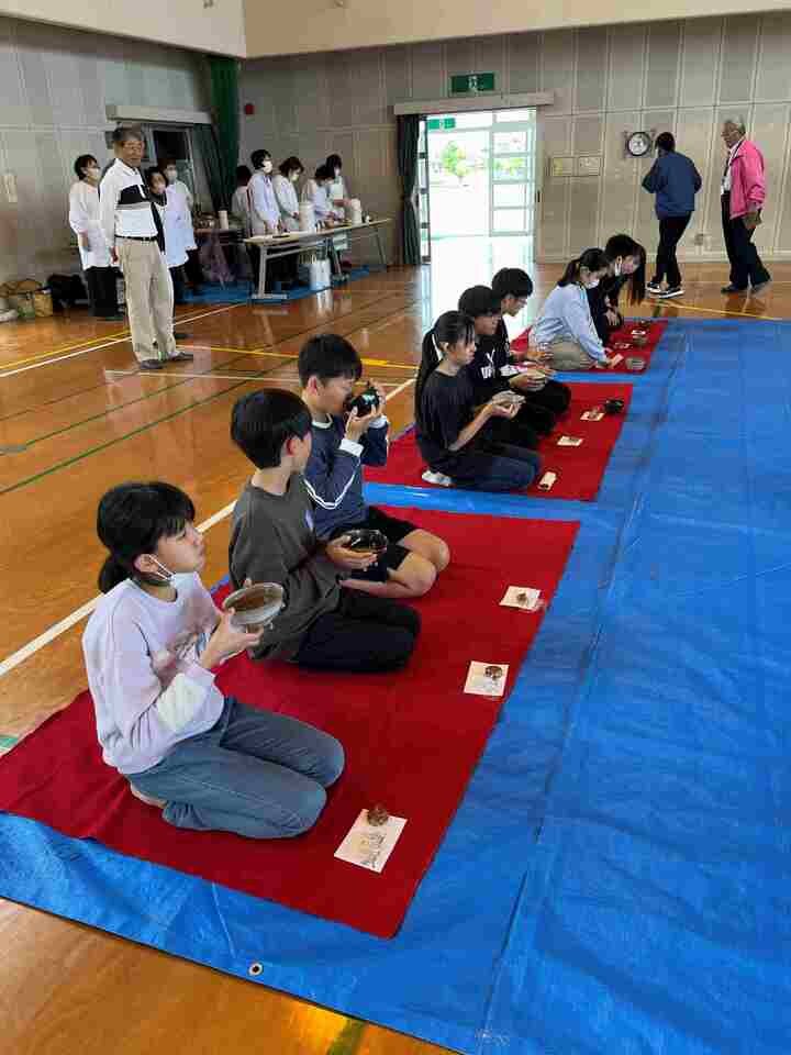 当日は、6年生59名をはじめ、校長先生ならびにご都合のついた先生方約15名にご参加いただきました。自治会長の皆様がお茶の振る舞いをされ、子どもたちと会話を楽しみながら交流する微笑ましい様子が見られ、会場は終始あたたかな空気に包まれました。初めて抹茶を口にする児童も多く、「苦い」、「美味しい」と笑顔を見せる姿、さらには「自分たちもお茶を立ててみたい」と興味を示す声も聞かれ、貴重な体験の場となりました。