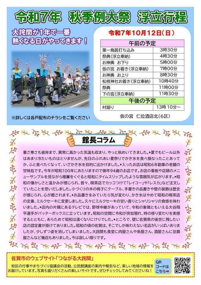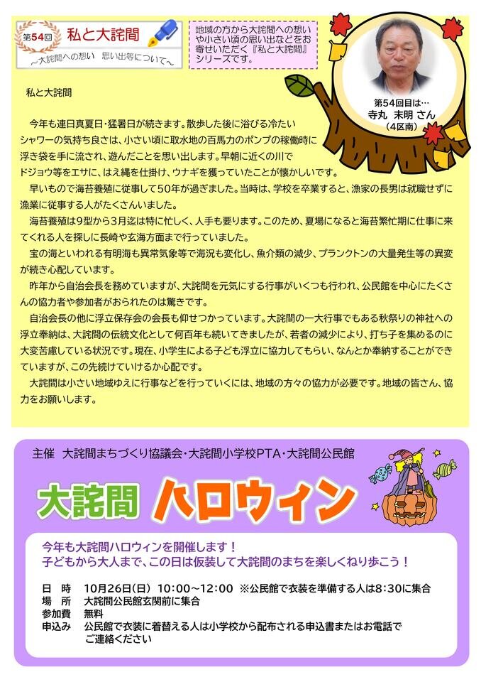 ■地域・学びのサポート⑦「今から知る・今日からはじめる介護のそなえ」 1面 ■全3回「初心者向けスマホ教室」のお知らせ 1面 ■公民館主催・共催事業と地域行事等の報告 2面 ■私と大詫間 第54回 3面 ■「大詫間ハロウィン」 のお知らせ 3面 ■令和7年 秋季例大祭 浮立行程 令和7年10月12日(日)のお知らせ4面