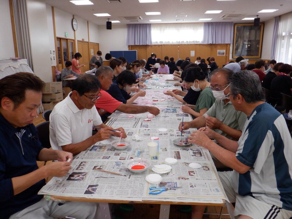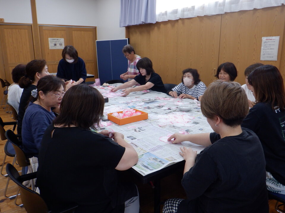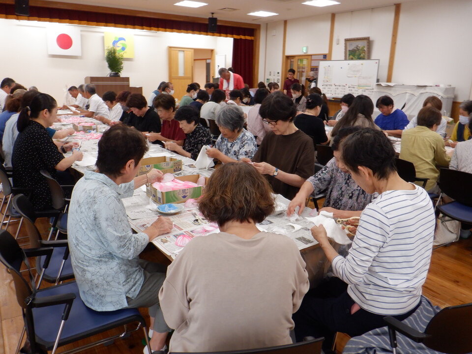 9月13日(土)に大詫間公民館に90名のボランティアが集まり、浮立の花つくりをしました。