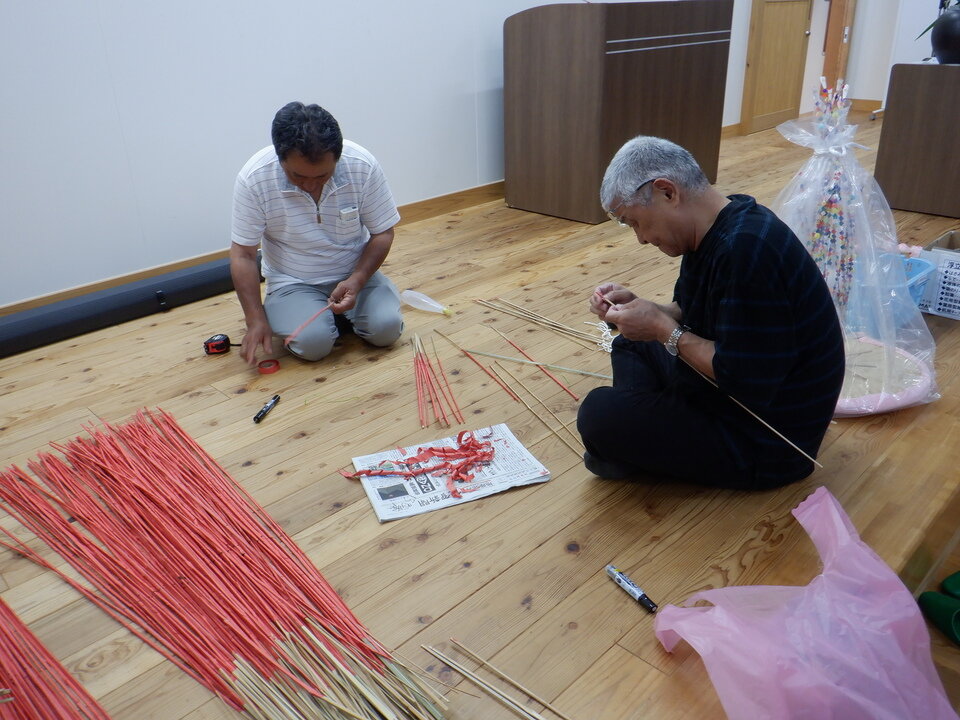 赤い紙を巻いた竹ひごに、花と葉っぱの形に切り抜いた紙を決められた位置と数の通りに貼りつけて出来上がりです。![]()
