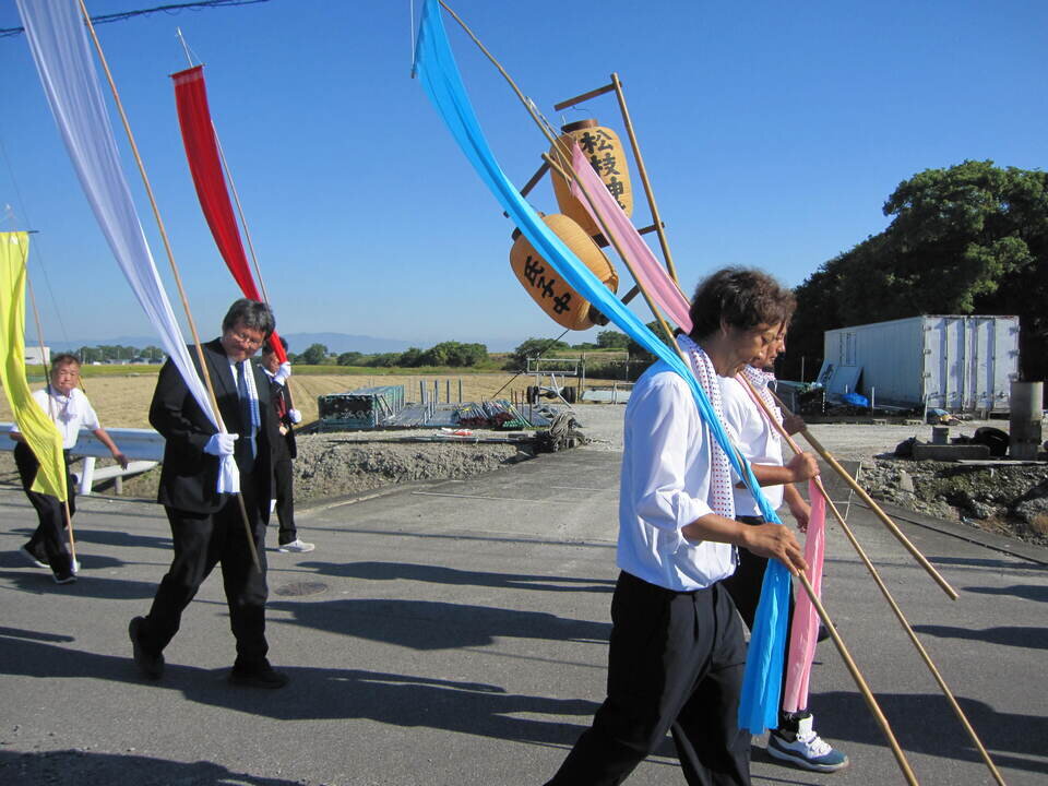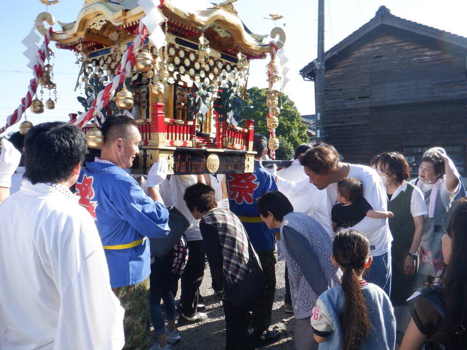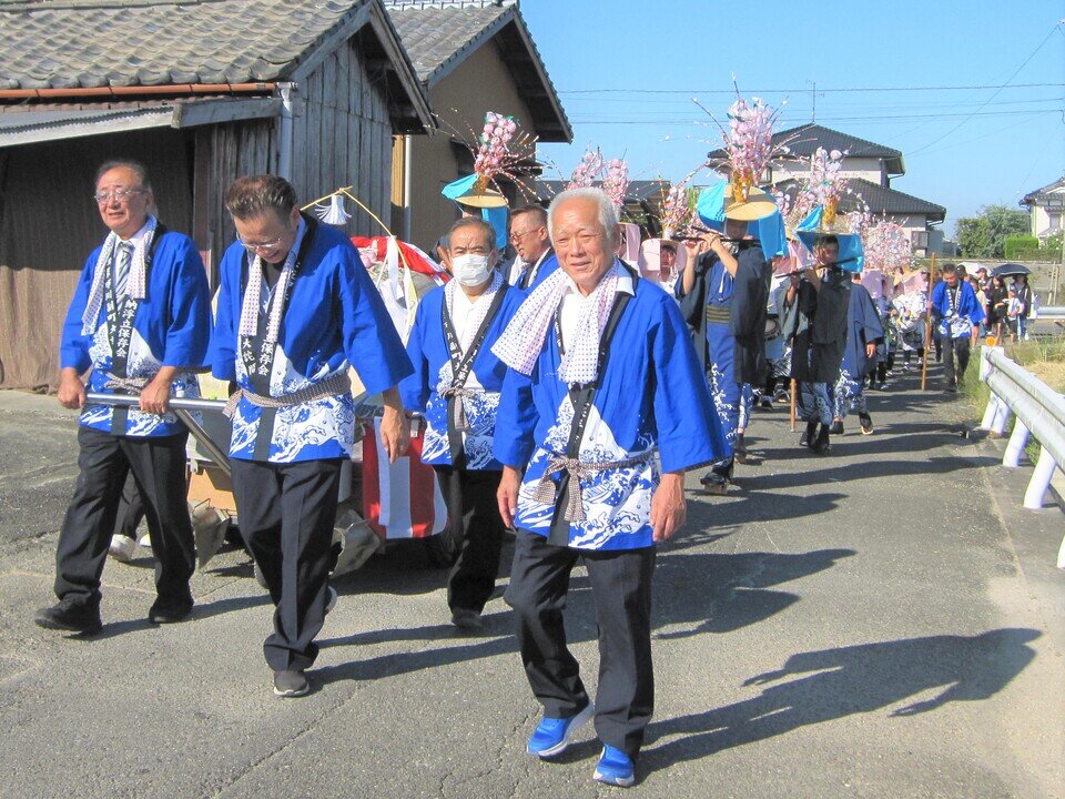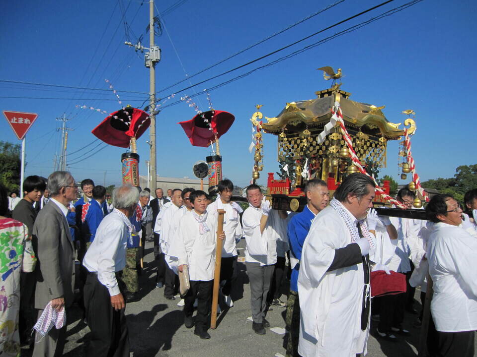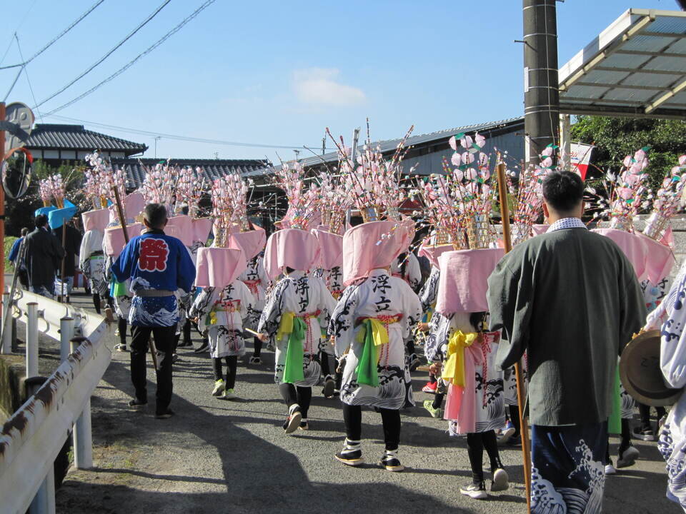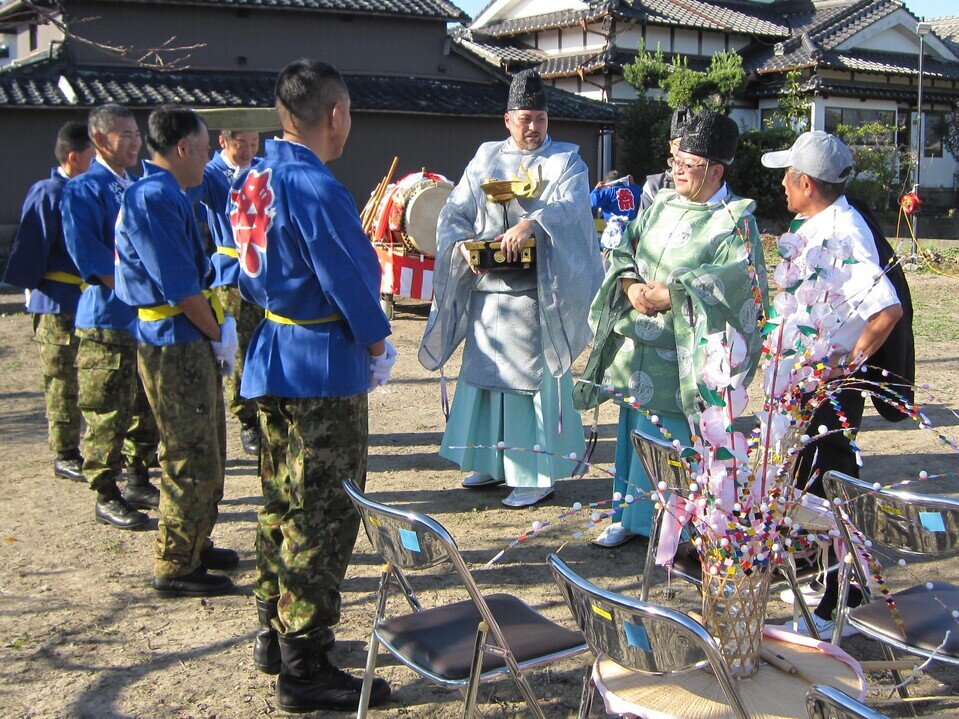 10月12日(日)の大詫間では、松枝神社秋季例大祭が行われました。夜明け前の3時30分に打ち込みの後、5時にお神輿に伴い仮の宮に向けて出発しました。今年の仮の宮は大詫間6区です。そして朝8時30分に仮の宮からお神輿が村なかを廻ってから松枝神社に向けて出発します。今回は、お神輿担ぎに駐屯地の隊員さんがボランティアとして参加されました沿道では多くの人がお神輿行列ならびに浮立を待っていました人々はご利益を求めて次々にお神輿の下をくぐっていました