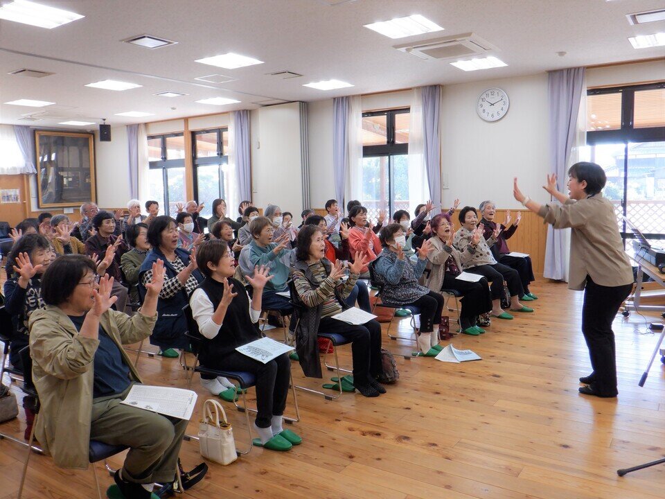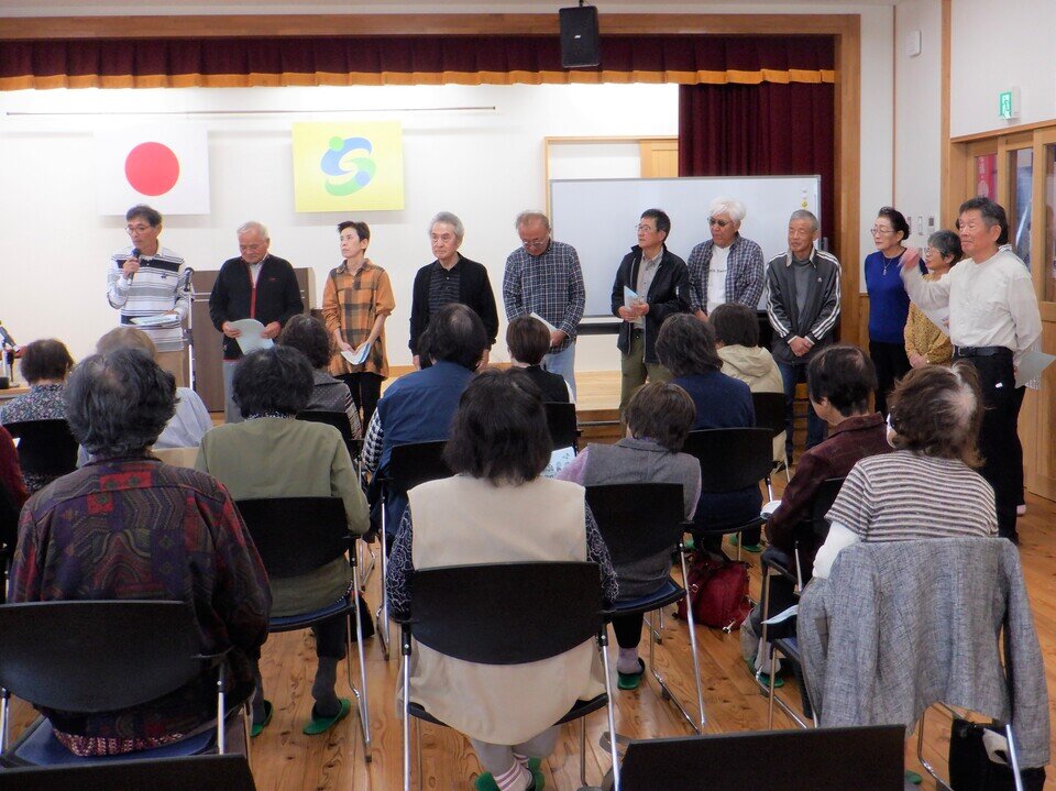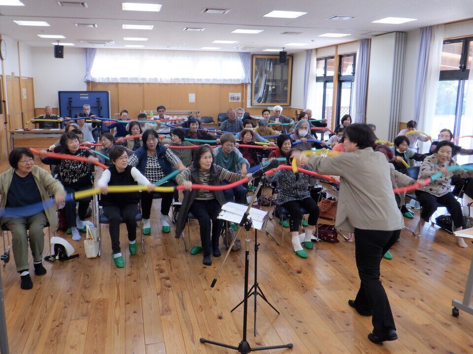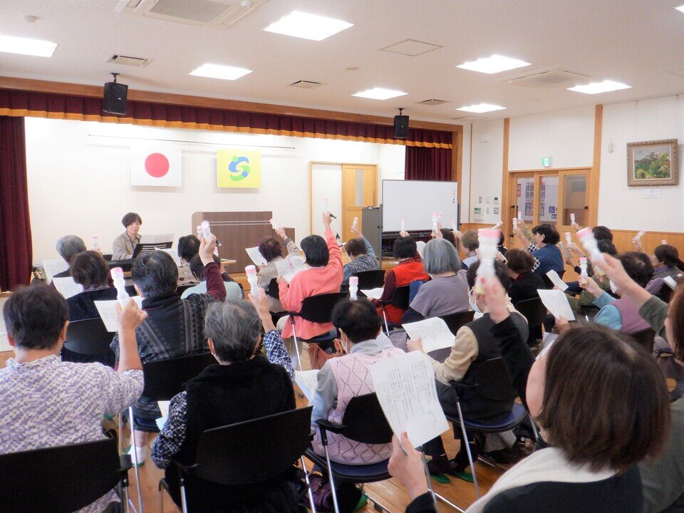馬場会長の挨拶のあと、大詫間校区社協役員の紹介がありましたつづいて、大詫間公民館サークル「ももの会」で指導をされている星山ひろみ先生による歌とレクレーションが行われました。懐かしい歌をみんなで歌ったり、手遊びや道具を使って体を動かしたりして楽しみました。楽しんだ後は、近くの人と語しながら美味しいお弁当と温かい味噌汁をいただきました。