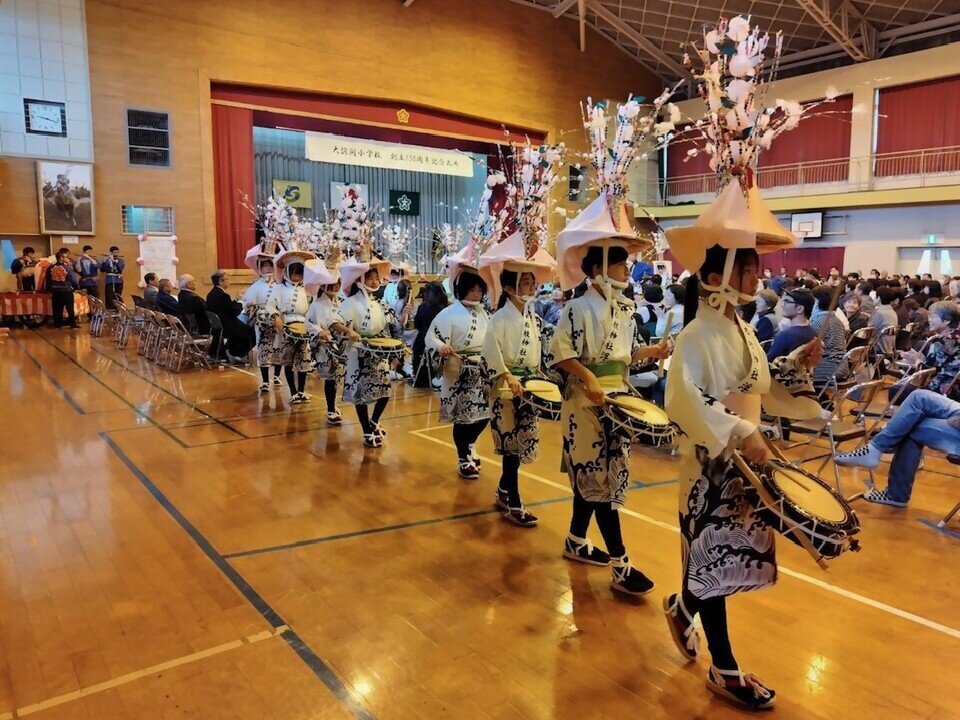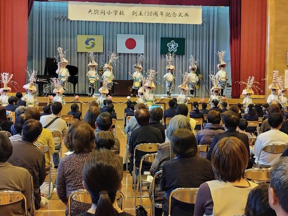 11月9日(日)に大詫間小学校体育館で大詫間小学校150周年記念式典が開催されました。アトラクションとして、大詫間小学校4年生以上20名による子ども浮立が披露されました。浮立保存会の皆さんにご協力いただき、会場は太鼓や笛や鉦の音やかけ声が響きわたりました。