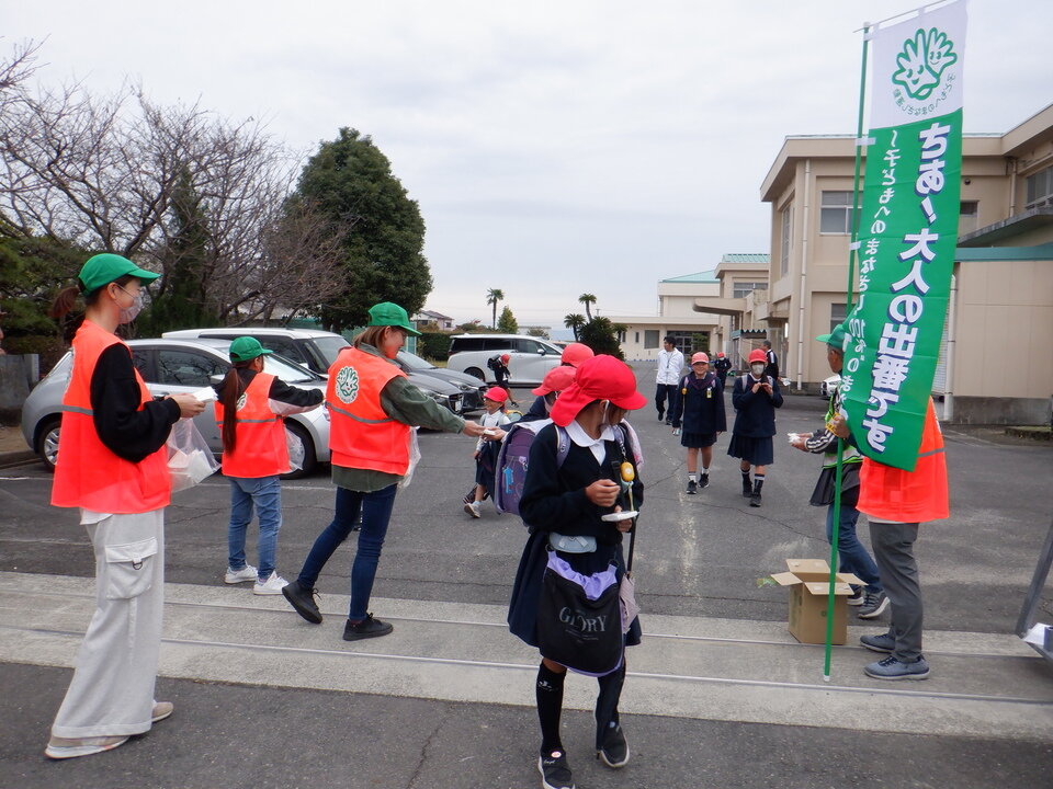 ベストや帽子を着用した役員が子ども達の下校時に啓発用品を渡しながら声掛けを行いました。どの学年も笑顔で元気に挨拶を返してくれました。