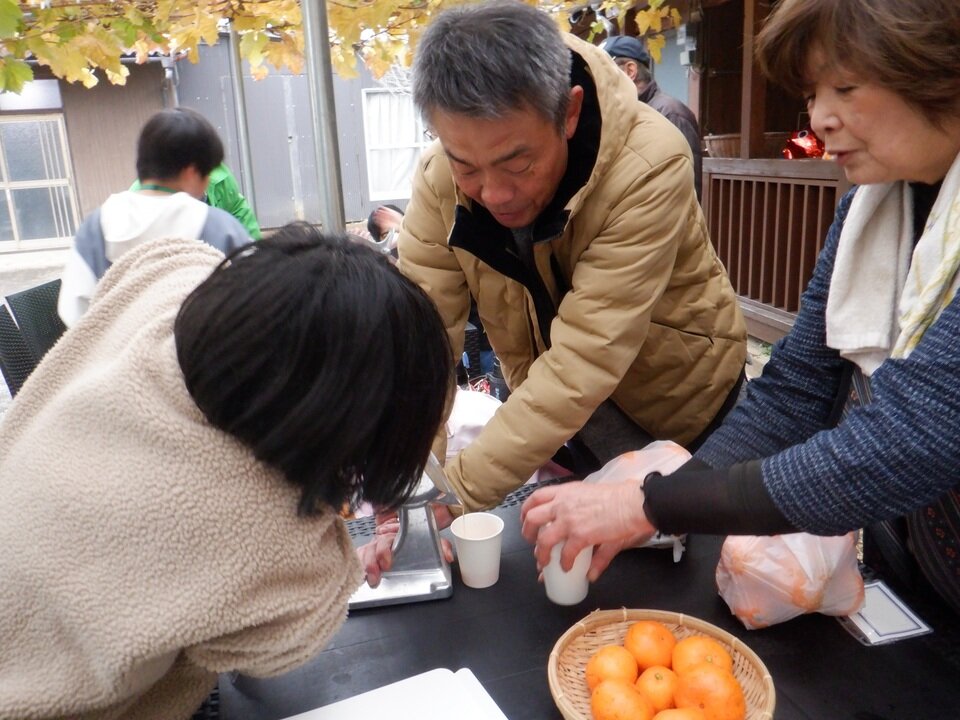 みかんを切る人と絞る人と、役割分担をしながら子どもと大人が一緒に絞っていました。