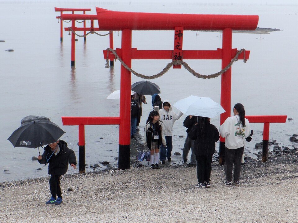次はバスで大魚神社の鳥居に移動しました。雨が降っており水位も高く、海中鳥居には行けませんでしたが、その手前で写真を撮ったり散策して楽しみました。![]()