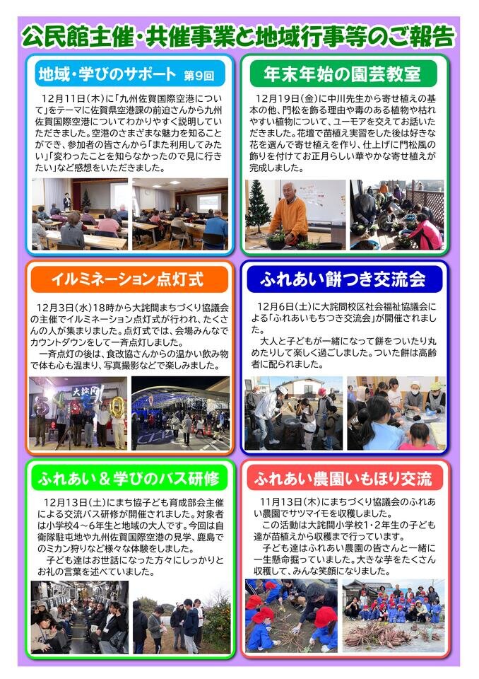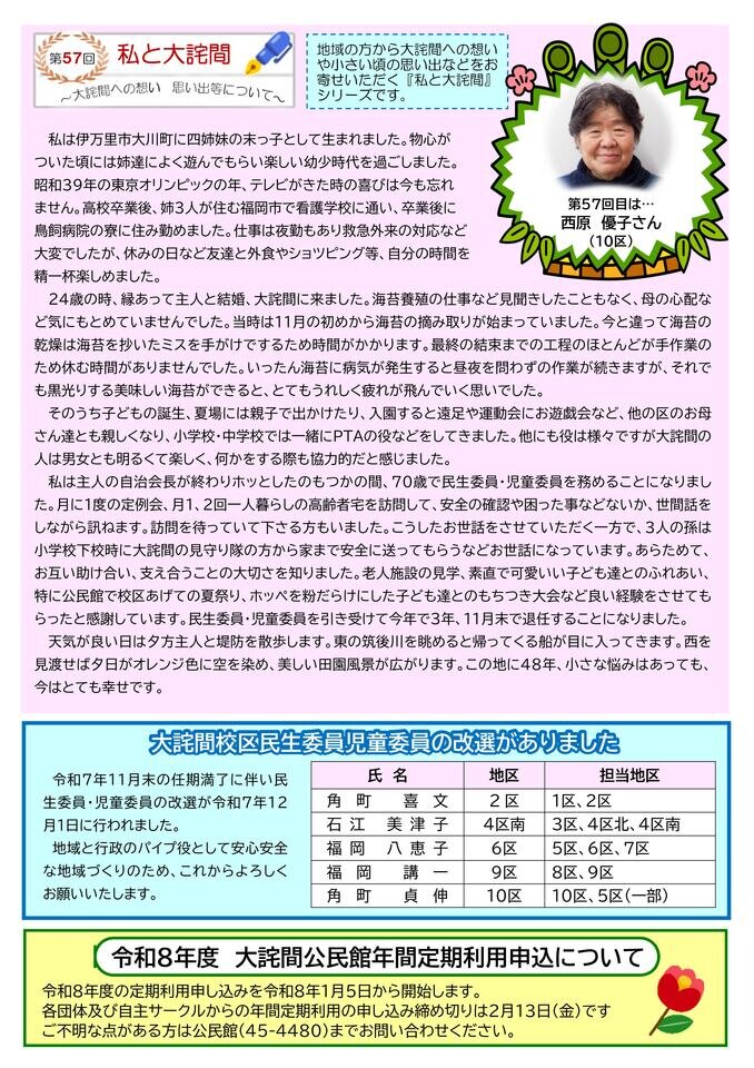 ■新年の挨拶 1面 ■「パソコン・スマホなんでも相談」 参加者募集のお知らせ 1面 ■公民館主催・共催事業と地域行事等の報告 2面 ■「私と大詫間 第57回」 3面 ■「大詫間校区民生委員児童委員の改選」のお知らせ 3面