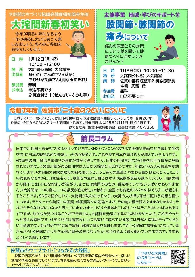■令和8年度 大詫間公民館年間定期利用申込について 3面 ■まち協(健康福祉)主催「大詫間新春初笑い」参加者募集のお知らせ 4面 ■「地域・学びのサポート⑩ 股関節・膝関節の痛みについて」 参加者募集お知らせ 4面 ■令和7年度 佐賀市「二十歳のつどい」について 4面 ■館長コラム 4面 ![]()