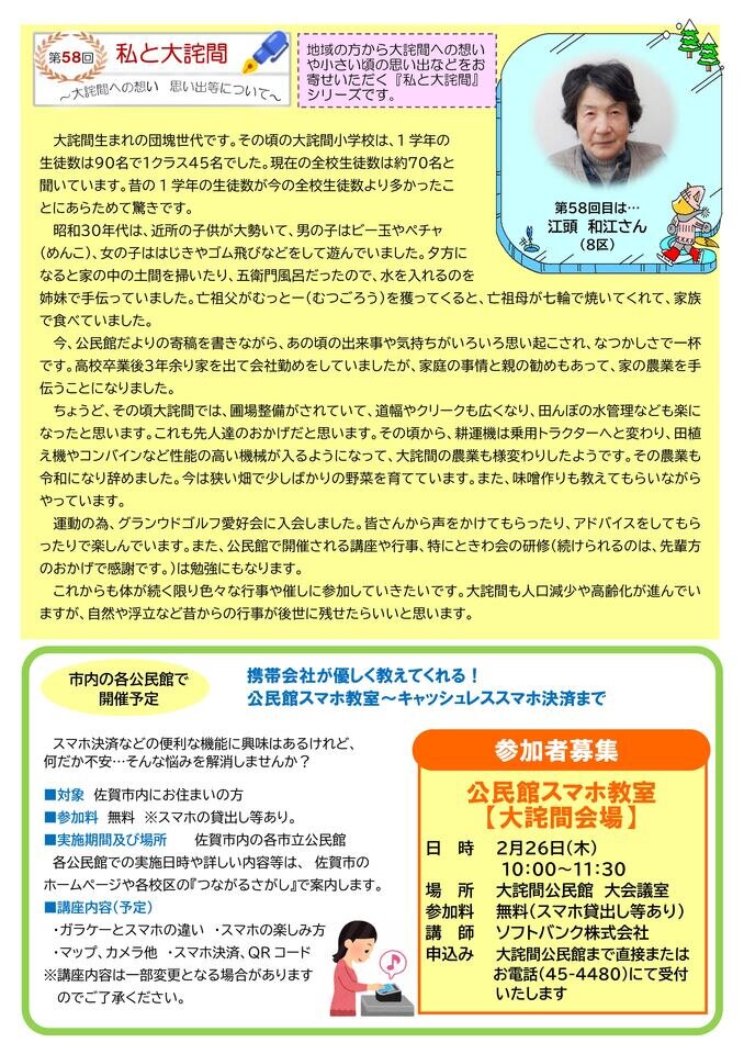 大詫間公民館だより2月号を発行しました。主な内容は以下のとおりです。