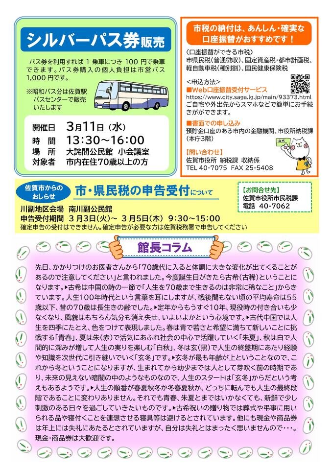 ■「シルバーパス券」販売について 4面 ■佐賀市からのお知らせ(市・県民税の申告受付について) 4面 ■館長コラム 4面