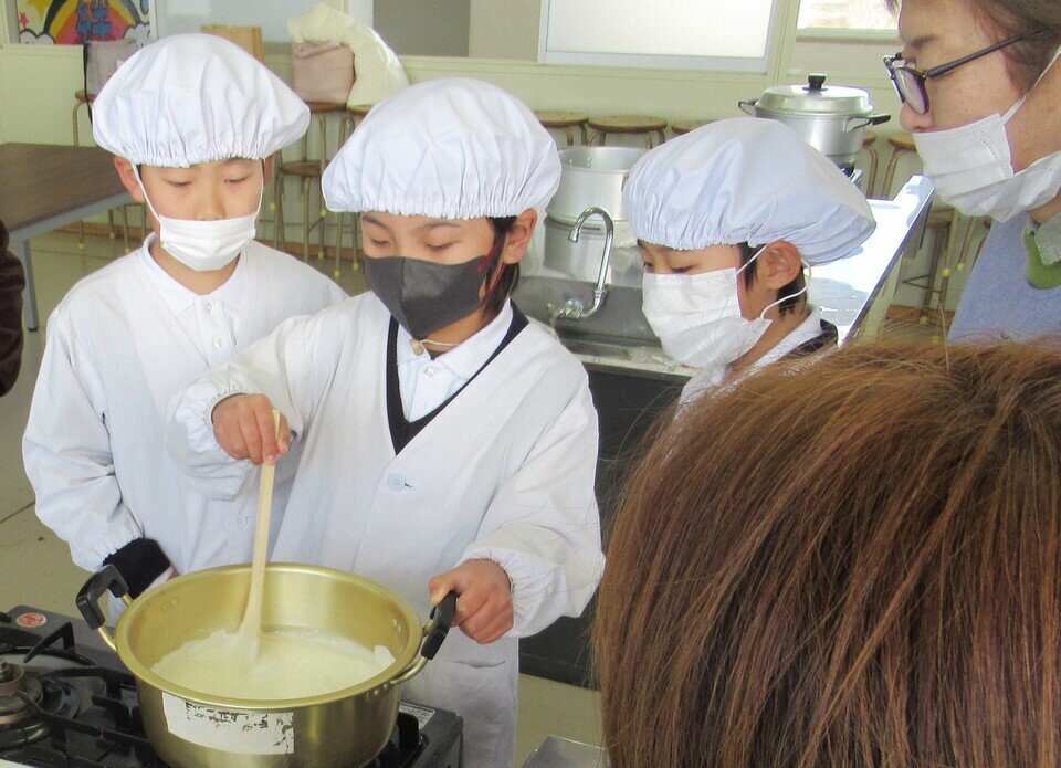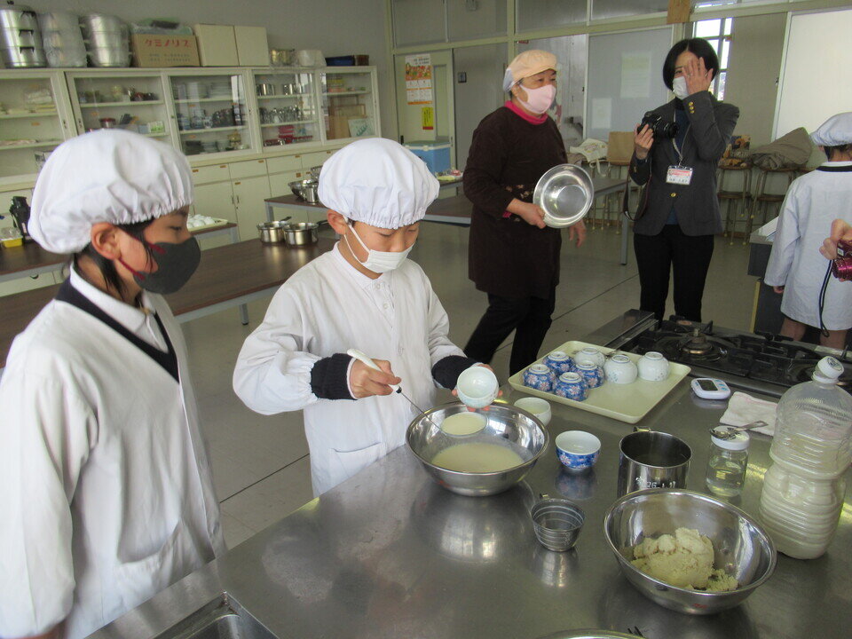 2月12日(木)に、大詫間小学校の地域学習として「大豆から豆腐づくり体験」が行われました。