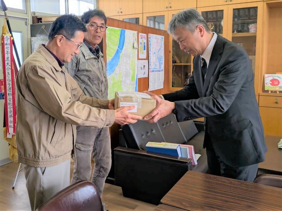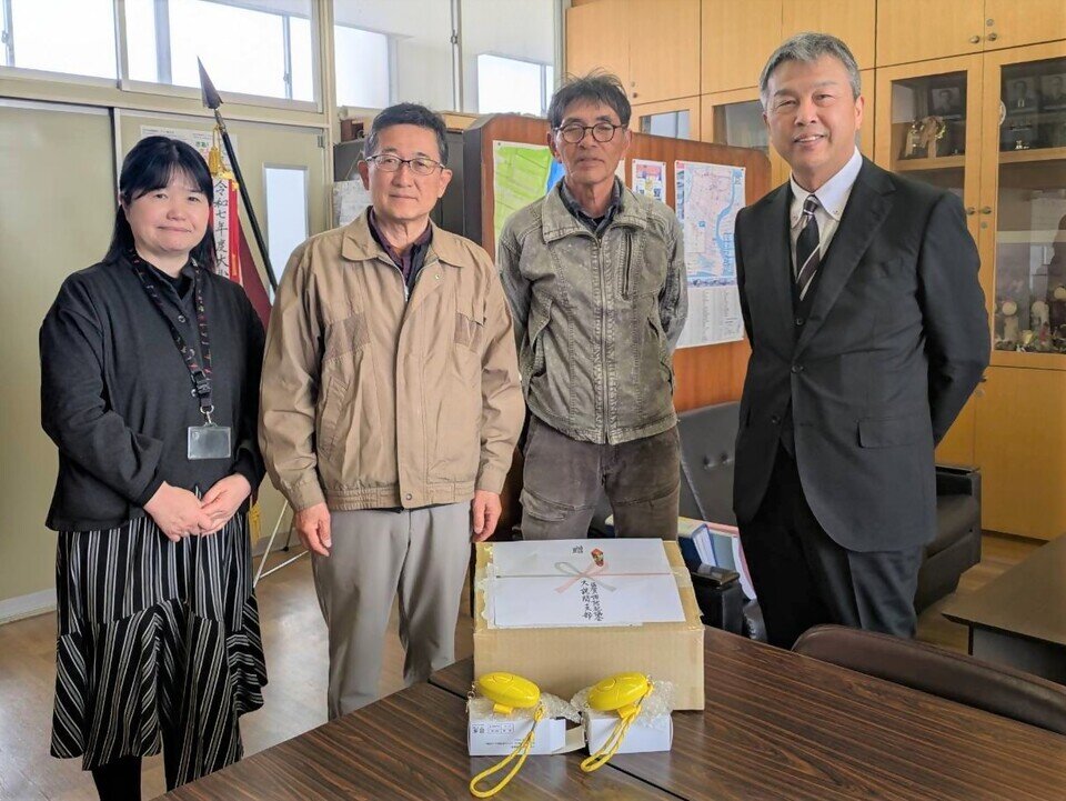 新入生の安全に役立ててもらおうと、3月24日(火)に大詫間防犯協会(長谷川定会長・馬場慶次副会長)から大詫間小学校の岩崎校長先生に防犯ブザーが贈呈されました。防犯ブザーは4月10日(金)の入学式で新入生13名に配られる予定です。子ども達が安心して学校生活を送れるよう地域で見守っていきましょう。