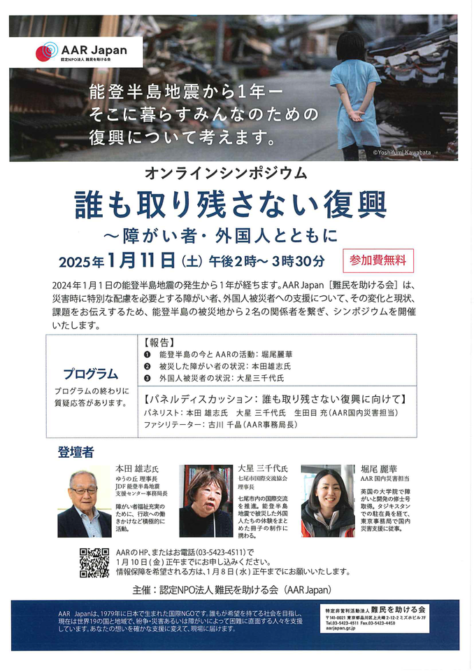2024年1月1日の能登半島地震の発生から1年が経ちます。 AARJapan [難民を助ける会]は、災害時に特別な配慮を必要とする障がい者、外国人被災者への支援について、その変化と現状、課題をお伝えするため、能登半島の被災地から 2 名の関係者を繋ぎ、シンポジウムを開催いたします。