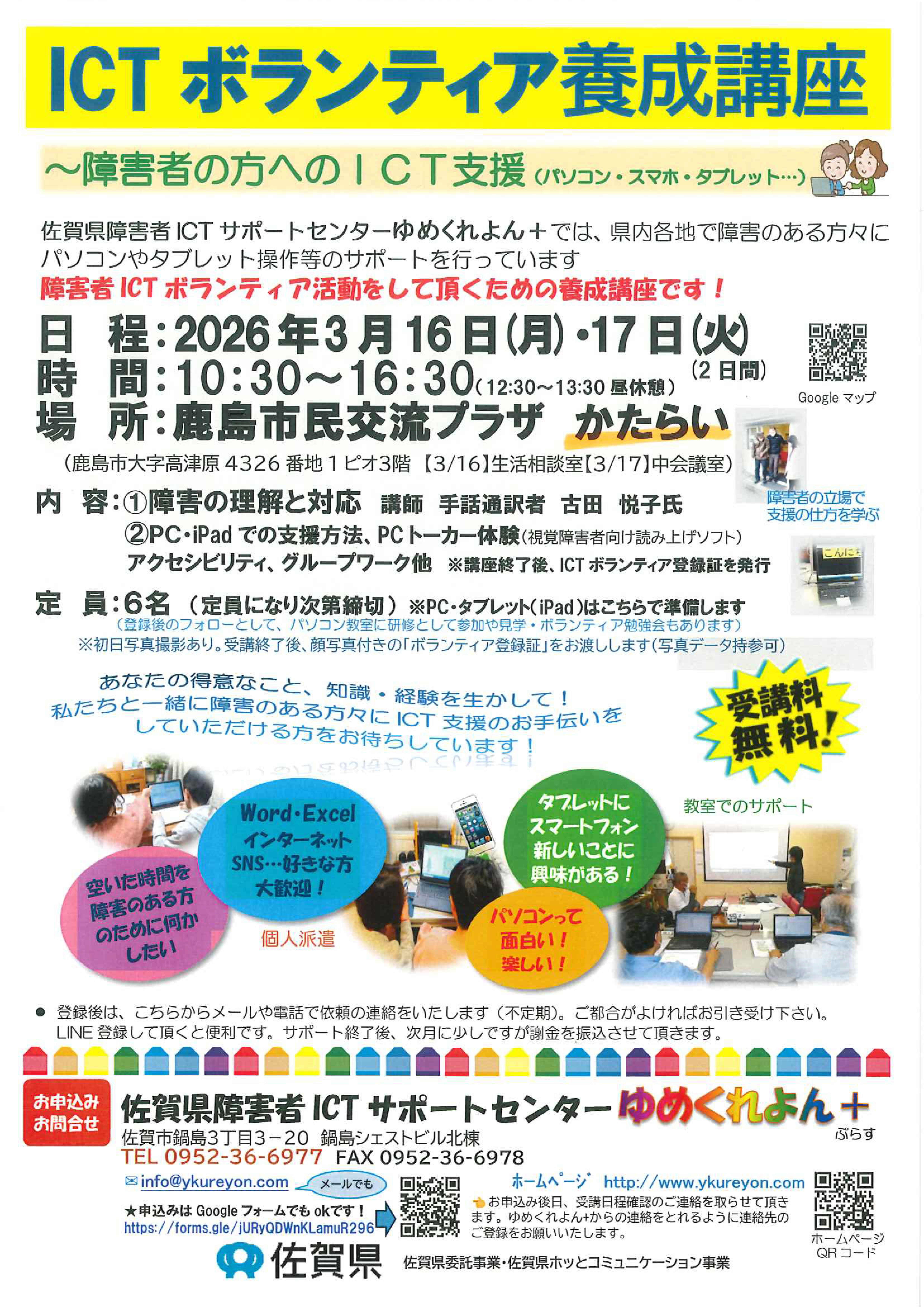 ~障害者の方へのICT支援(パソコン・スマホ・タブレット・・・)~佐賀県障害者ICTサポートセンターゆめくれよん+では、県内各地で障害のある方々にパソコンやタブレット操作等のサポートを行っています-障害者ICTボランティア活動をして頂くための養成講座です!-