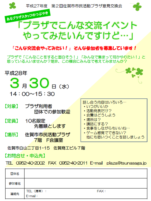 プラザで「こんなことをすると面白そう!」「みんなで集まって何かやりたい!」と思っている人いませんか?是非、この機会にみんなで考えてみませんか?
