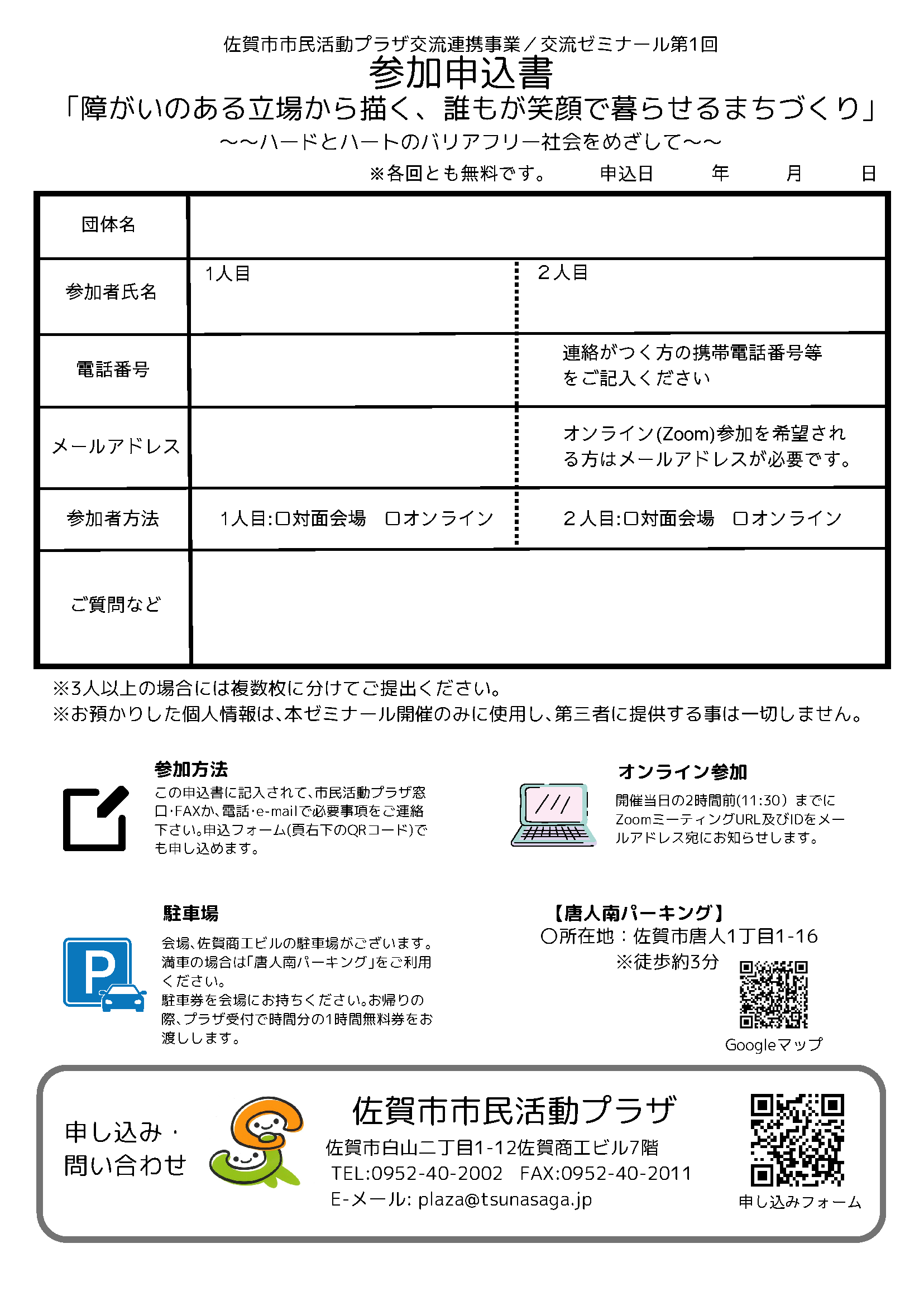 チラシ裏面にある参加申込書の必要事項を記入のうえ、プラザ窓口・FAX・電話・メールにてお知らせください。