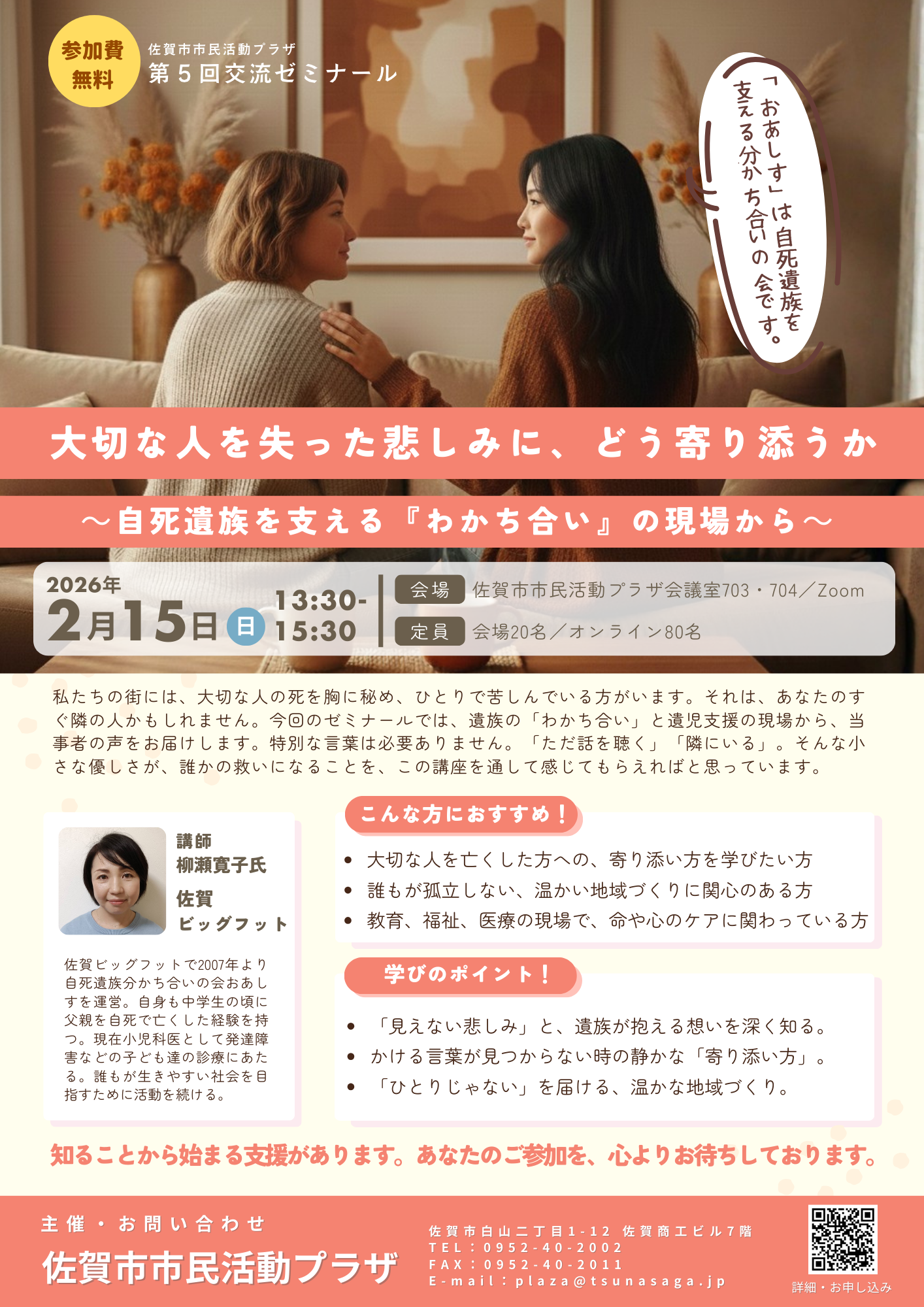 大切な人を自死で亡くされた方は、偏見や「止められなかった」という自責の念から、誰にも本音を言えずに孤立してしまう現状があります。本講座では、遺族のわかち合いの会「おあしす」の現場から、普段は見えにくい当事者の心の変化や、「安心して話せる居場所」がなぜ必要なのか、その背景を深く学びます。 かける言葉が見つからない時の、静かな「寄り添い方」