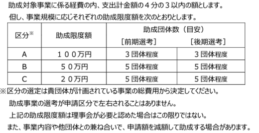 団体の人員構成が最小行政区である市町村から広く募った10人以上から成り、かつ、佐賀県内に活動拠点を置き、児童の教育と健全育成、社会福祉の増進への寄与、文化事業の普及活動等を行う団体を対象とします。(事務局の本部が他県にあっても構いません。)