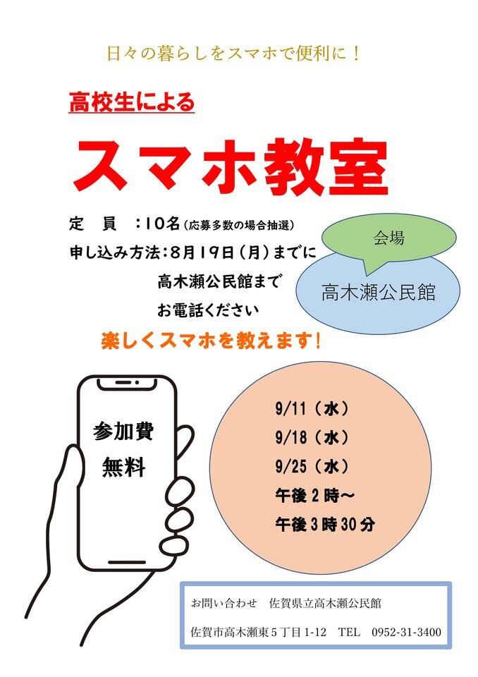 日時:9月11日(水)・18日(水)・25日 (水)14時から15時30分会場:高木瀬公民館定員:10名(応募多数の場合抽選)