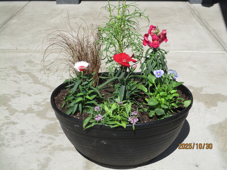 思い思いの花苗を配置して、寄せ植え完成となりました。