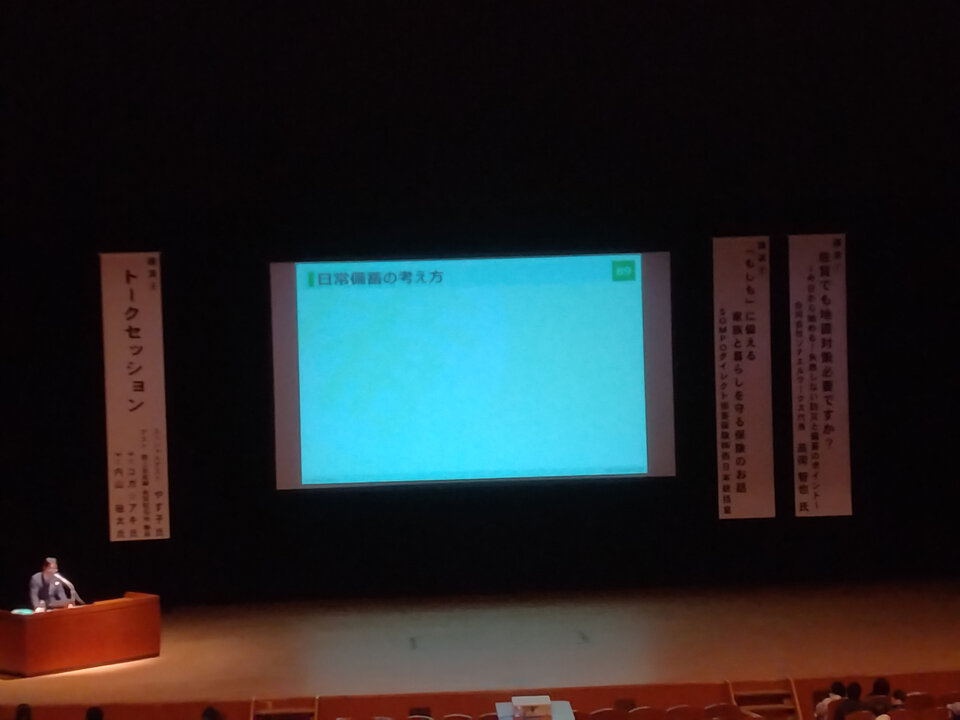 坂井市長のあいさつ後、「備え・防災アドバイザー」の高荷智也さんから「佐賀でも地震対策必要ですか?~今日から始める!失敗しない防災と備蓄のポイント~」と題して、佐賀でも大地震は「佐賀平野北縁断層帯」があり大きな地震が起こりうること、ではどうするか? 自分がいる場所で発生したらその時どう行動するという意識を持つこと、備蓄に関しては優先順位を決めること、例えば自分の体の一部である眼鏡等や体調維持に必要な薬を優先することなどをお話しされ、参考になりました。