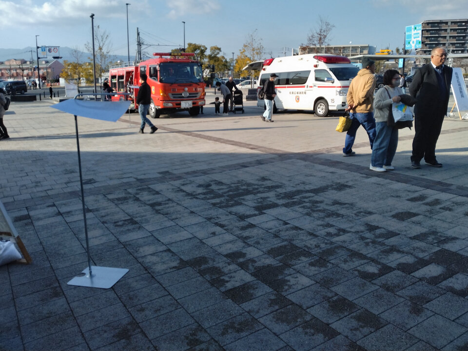 大ホールホワイエでは、市建築指導課の展示の他、備蓄品の展示と販売も行われ盛況でした。また、屋外では災害時に働く車が展示され、親子連れが楽しまれていました。