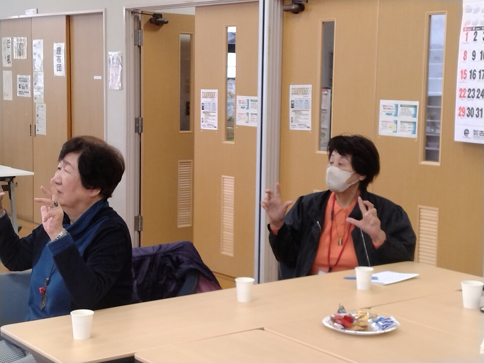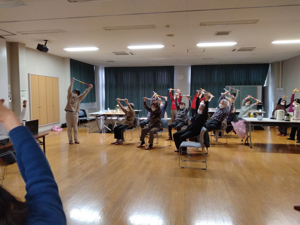 この日は、おたっしゃ本舗城北の林さんの指導で、指の体操、ミニ講話、新聞紙で作った筒を使った体操で盛り上がりました。休憩をはさんでグループに分かれての情報交換、情報共有が行われ、活発な意見が交換、共有されていました。