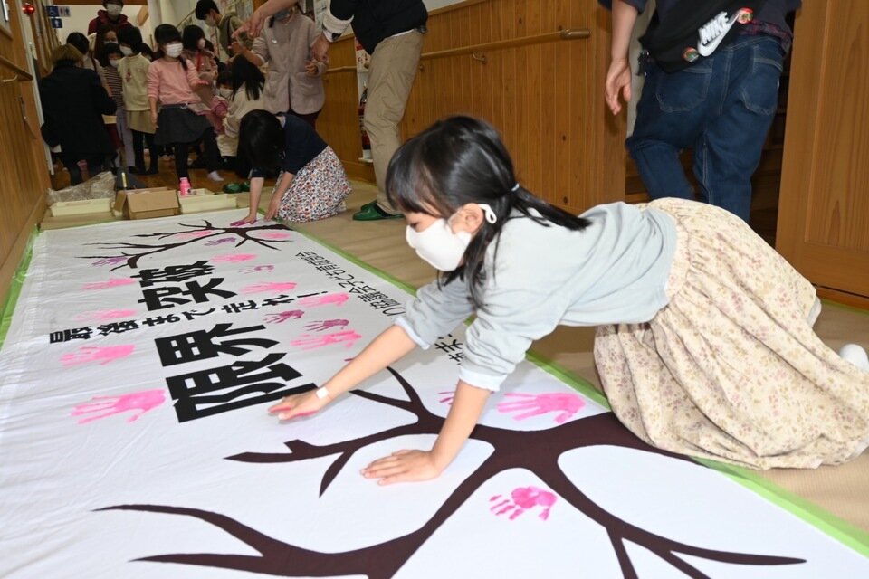 制作日には若楠小学校の児童が集まり、「桜」を模した桜色の手形を押して飾り付けをしました。