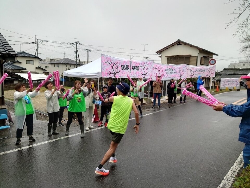 多布施川沿いの桜並木を通り、最終関門を迎える40キロ手前、ランナーが一番キツくなってくる地点で、手形で桜を模した応援幕を掲げ、若楠小学校の児童を中心とした応援隊でランナーの"最後の一歩"を後押ししました。