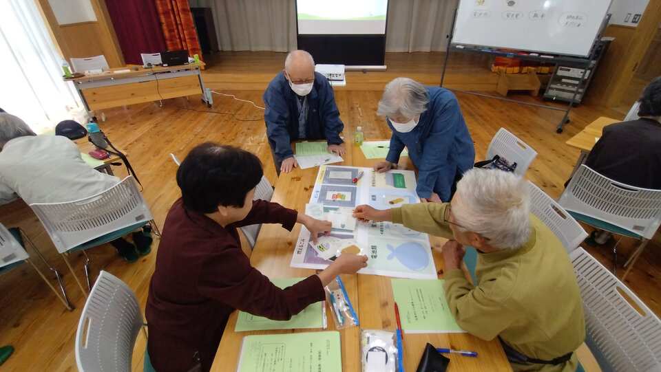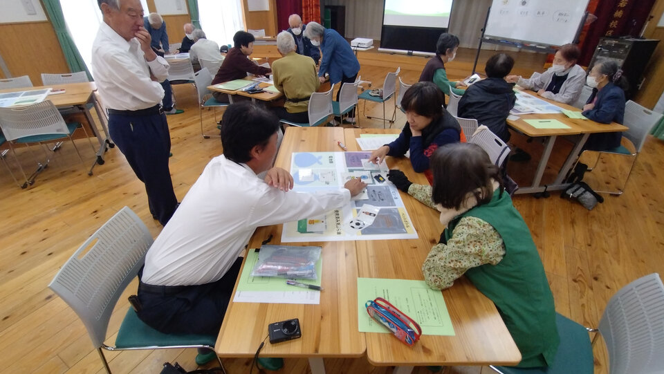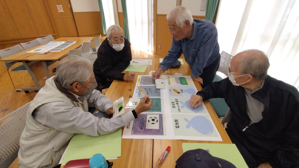 4つのグループに分かれ、燃えるごみ、燃えないゴミ、ビン・缶、ペットボトル、電池類、蛍光管、紙類、布類、廃油回収と9つに分けられた模造紙に、話し合いながら20枚のごみカードを分けていきました。